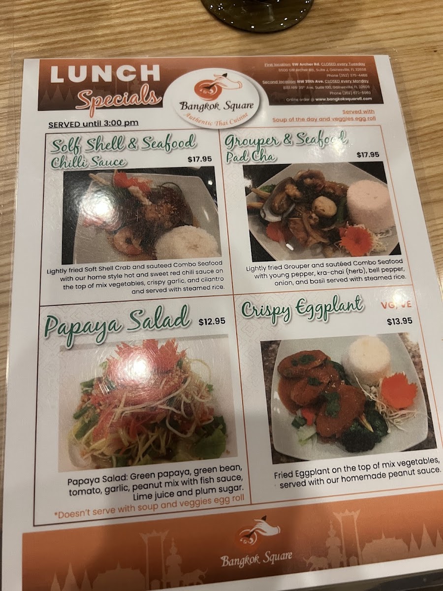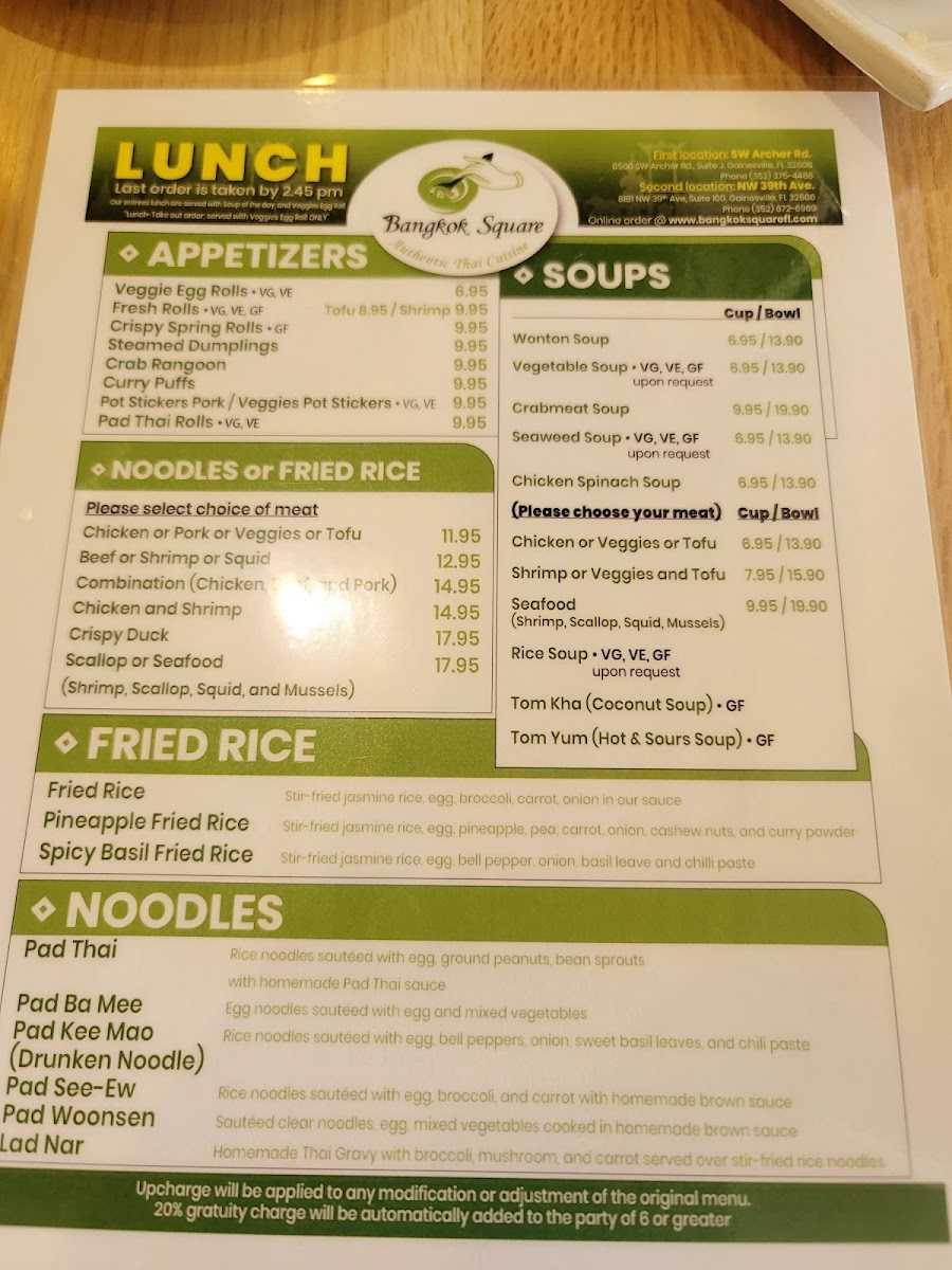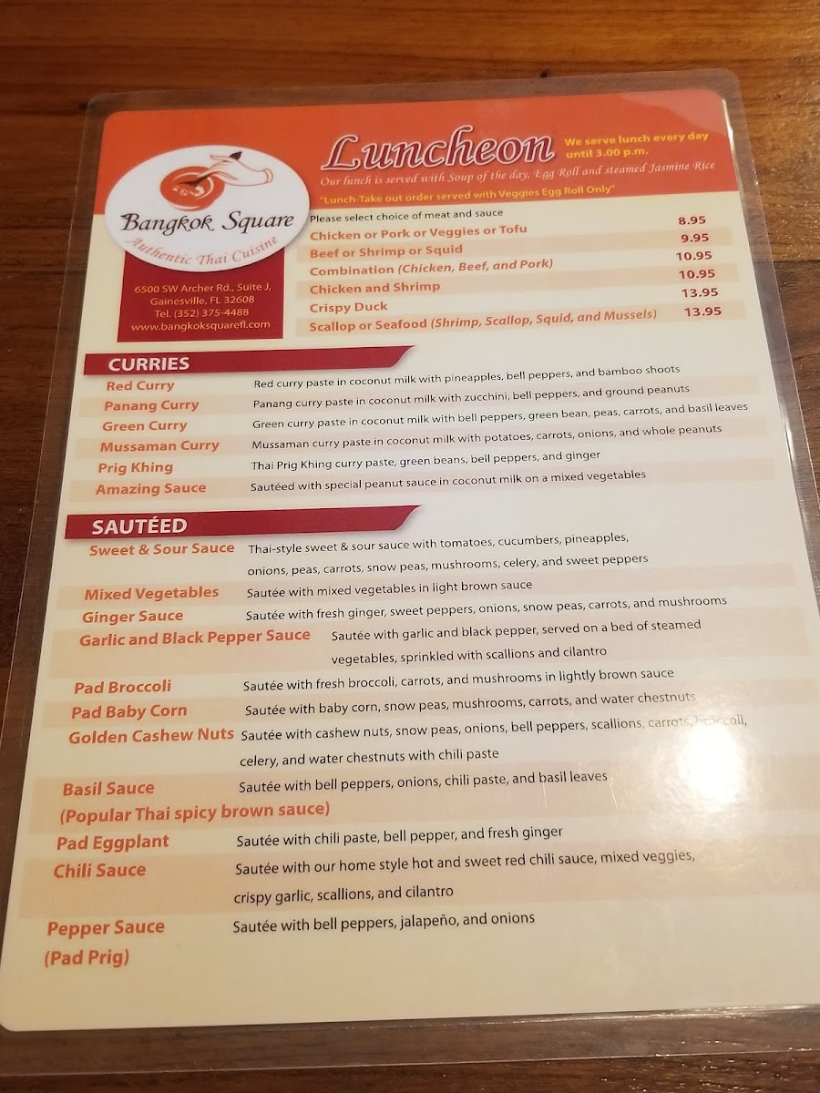 Welcome to Bangkok Square, a hidden gem nestled in Gainesville, Florida. This Thai restaurant offers an authentic taste of Bangkok, delighting patrons with a diverse menu that caters to all preferences. Start your meal with their flavorful wonton soup or indulge in the seafood soup, brimming with fresh shrimp, scallops, and mussels. The noodle dishes are a highlight, with classics like Pad Thai, skillfully crafted with rice noodles, bean sprouts, and homemade sauce, and the robust Drunken Noodle, featuring a rich combination of egg and bell peppers.